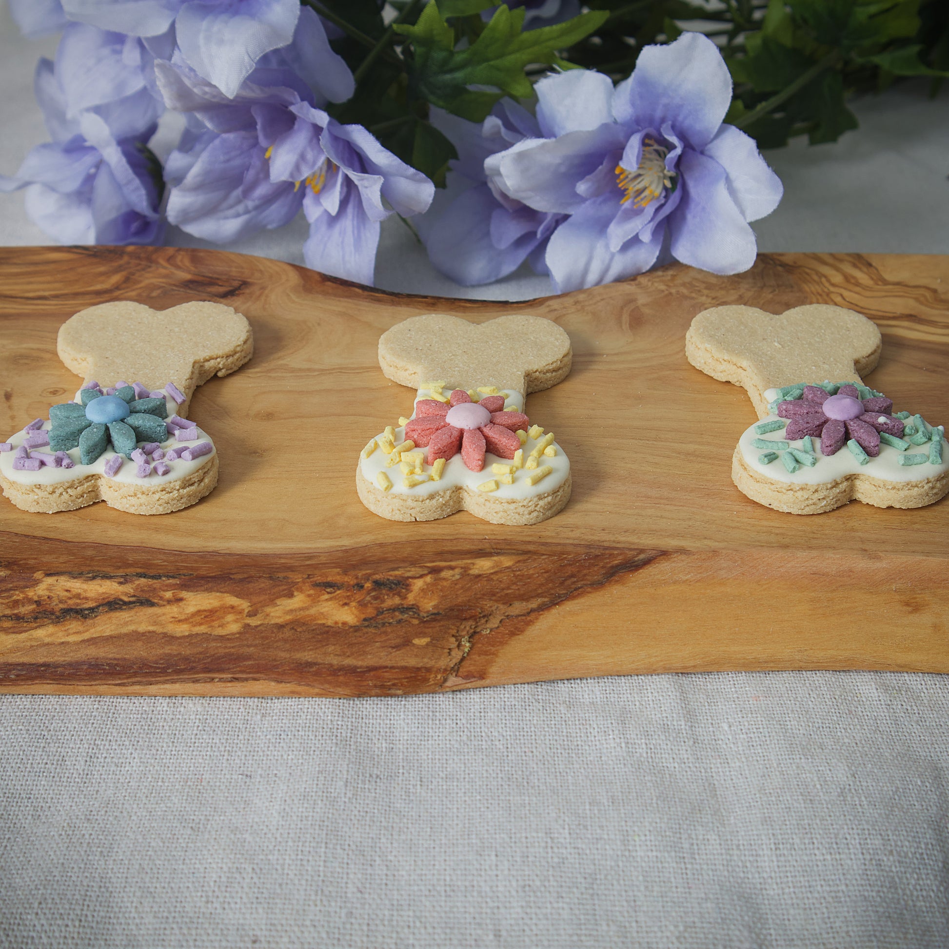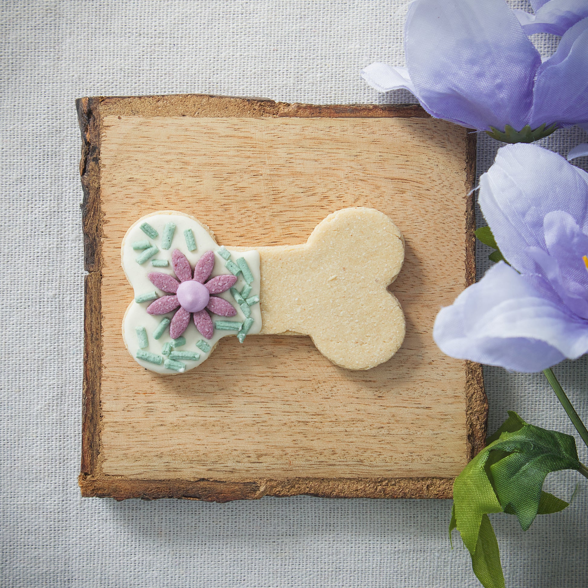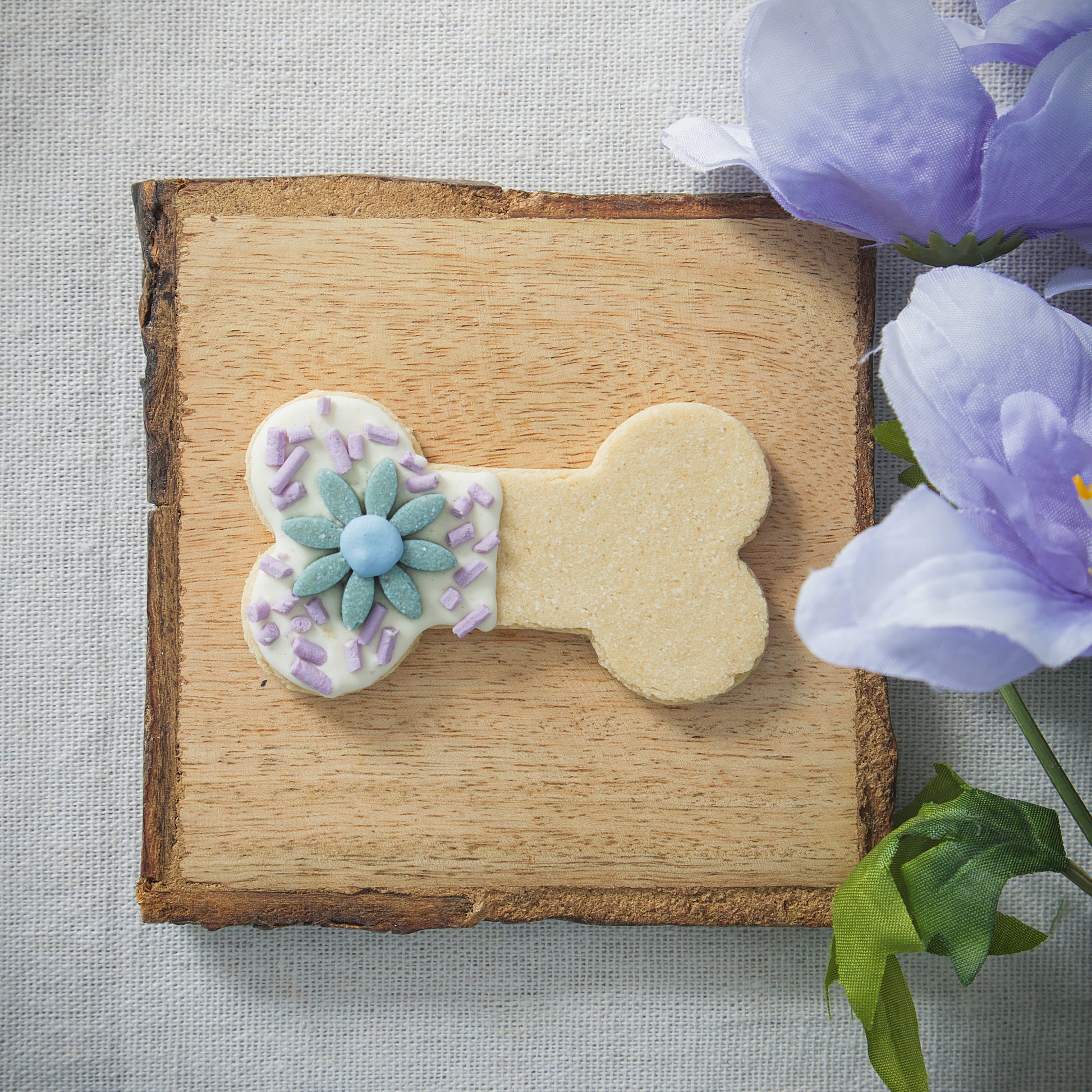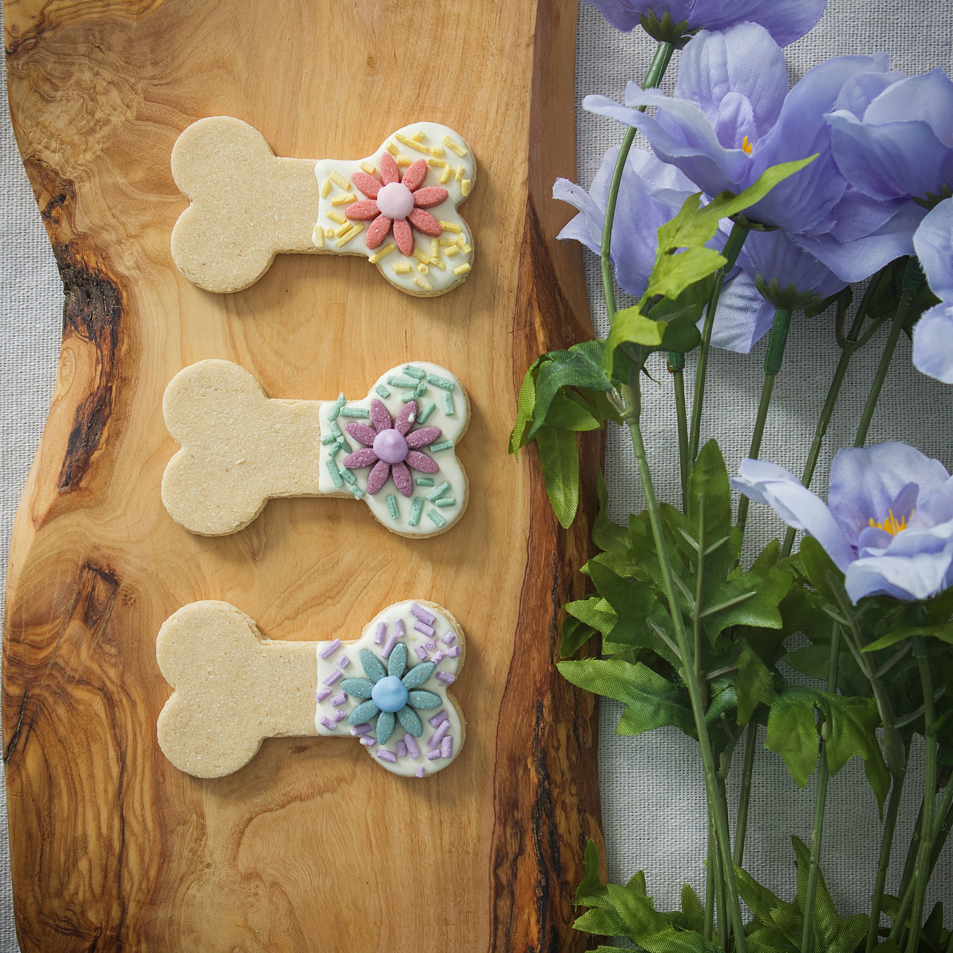 Includes: 6x 3 inch Bones, topped with white icing, and your choice of daisy colors and sprinkles, individually wrapped in 100% home compostable cellophane, in a bakery box.