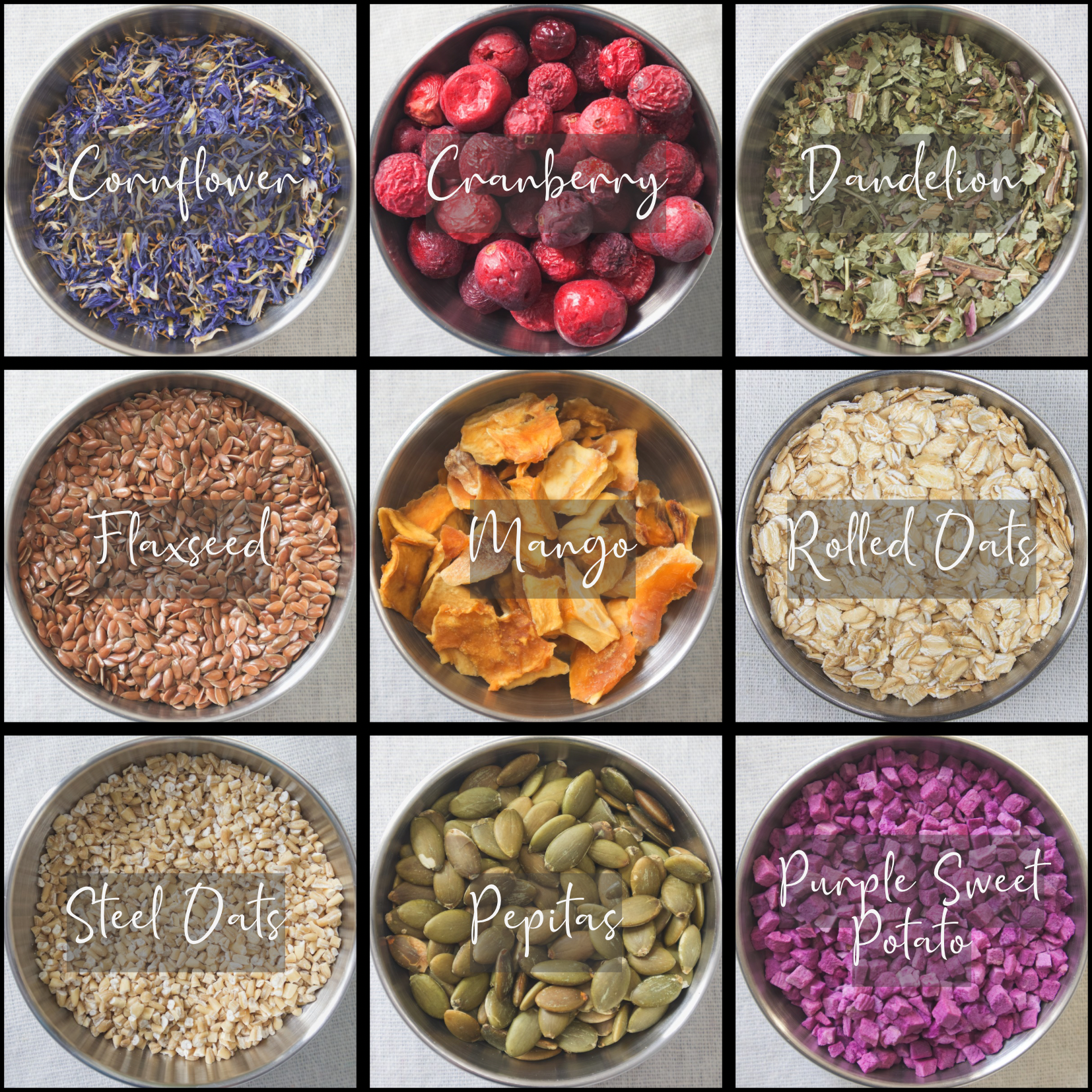 BASE: Organic Brown Rice Flour, Greek Yogurt, Single Ingredient Peanut Butter, Organic Coconut Flour, Organic Pasture Raised Eggs, Michigan Honey.